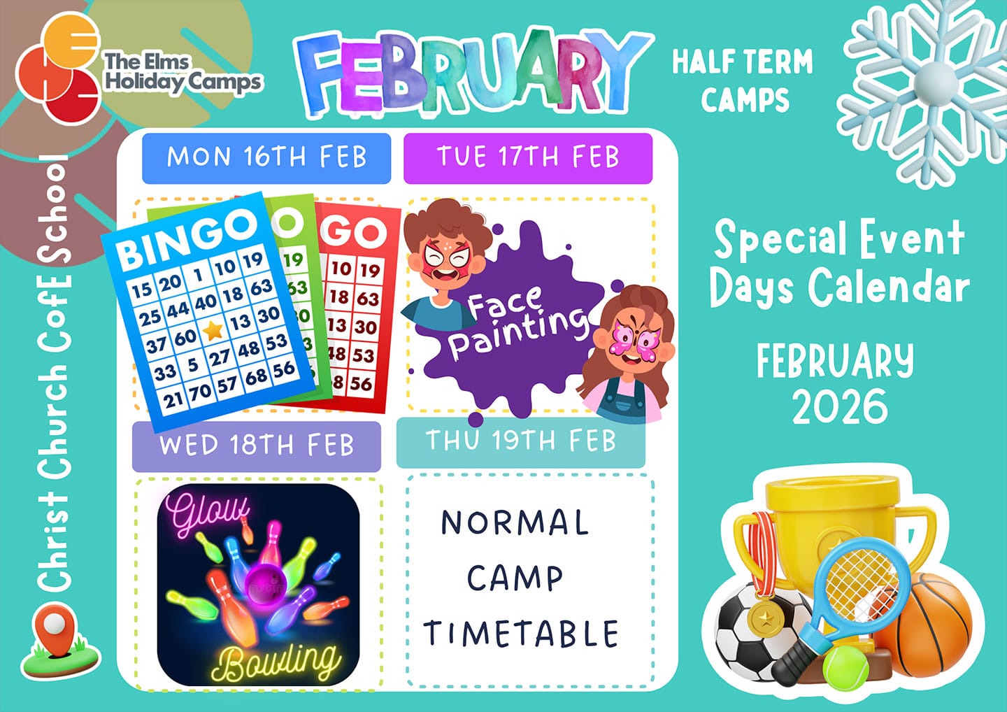 The registration point for Christ Church School is in the school hall. On arrival at the school, please follow signs for the main office where Elms staff will greet you and escort the children to the hall for registration.